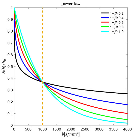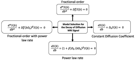 A key feature of the anomalous diffusion exhibited in DW-MRI is the fall-off or reduction of the decay rate at b-values above 1000 s/mm2. A recent paper [14] surveyed integer order models of this phenomena, where the apparent diffusion coefficient D0 was expressed as a decaying function of b with a separate decay rate, D1, for example, D(b) = D0exp[−(bD1)]. Here, we focus on fractional order models for systems with both a constant and an inverse power law decay rate. A summary of our approach is given in Figure 2, which illustrates the different integer and fractional order models that will be described. For the integer order case, with a constant diffusion coefficient, D(b) = D0, the linear differential equation model, yields the classical exponential decay, S(b)/S0 = exp[−(bD0)]. A common extension of this model [23,24] assumes an inverse power law decay rate, D(b) = (1 + β)D0(bD0)β, where −1 < β < 0. This integer order, linear differential equation has a stretched exponential solution, S(b)/S0 = exp[−(bD0)(1+β)], which has often been used to fit DW-MRI signals (see, [17,24,25]). The fractional β parameter is zero for the cases of normal and hindered diffusion, as in CSF and gray matter, but less than one for situations where anomalous diffusion appears—such as in brain white matter. Nevertheless, this signal decay model is still exponential, and will decay faster than a power law at high b-values.