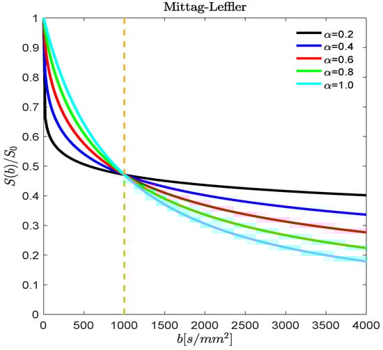 The normalized stretched Mittag-Leffler signal decay of S(b)/S0 is plotted versus b-values between 0 and 4000 s/mm2, with D0 = 1 × 10−3 mm2/s. Five values for α = 0.2, 0.4, 0.6, 0.8, and 1.0 are displayed. The last value in this sequence, corresponding to α = 1, gives the single exponential function. As the value of α decreases, the shape of the decay curve transitions from stretched exponential to an asymptotic power law decay.