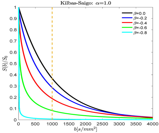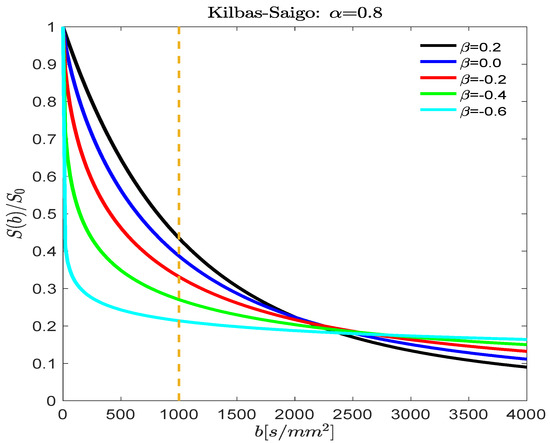 The normalized stretched Kilbas-Saigo signal decay of S(b)/S0 is plotted versus b-values between 0 and 4000 s/mm2, and D0 = 1 × 10−3 mm2/s with α = 0.8, and β = 0.2, 0, −0.2, −0.4, and −0.6. In this figure, we observe the effects of both α and β on the decay.