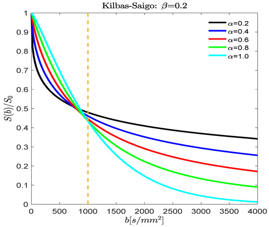 The normalized stretched Kilbas-Saigo signal decay of S(b)/S0 is plotted versus b-values between 0 and 4000 s/mm2, and D0 = 1 × 10−3 mm2/s with β = 0.2, and α = 0.2, 0.4, 0.6, 0.8, and 1.0. In the figure, we see for a fixed power law decay of D(b) the shift from lower to higher decay rates as α approaches the exponential function.
