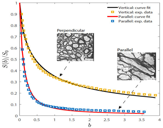 An example of the normalized stretched Kilbas-Saigo signal decay fits of S(b)/S0 to the bovine optic nerve data for the parallel and perpendicular directions with Δ = 30 ms. The photomicrographs are from [35] and are used with permission from the journal Magnetic Resonance in Medicine.