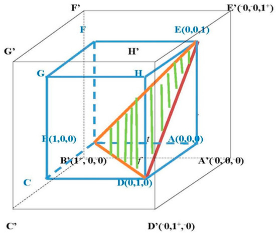 where = membership degree, = hesitant degree, and = nonmembership degree, whose domain is the main cubic diagonal triangle that connects the vertices: , , and , i.e., triangle BDE (its sides and its interior) in Figure 1.