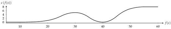 This section demonstrates how NRBA can be applied for a multiobjective trajectory optimization. The trajectory represents the planned vehicle velocity with respect to time measured from present into the future and is a B-spline function as defined in Equation (4) with degree , knot vector , and coefficient vector . Due to its interpretation as a temporal velocity trajectory, we refer to the B-spline function as instead of . has equidistant and strictly monotonously increasing entries