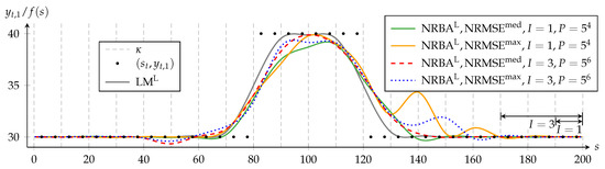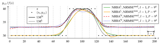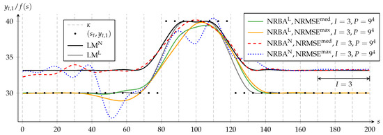 In the MPF, is subdivided into whereby the KF optimally estimates the linear state vector and a PF estimates the nonlinear state vector . Exploiting linear substructures allows for better estimates and a reduction of the computational effort. Therefore, the MPF is beneficial for mixed linear/nonlinear state-space models [46]. Due to Equations (4) and (6), linear substructures will occur in approximation problems as long as there are target criteria that refer to the value of the B-spline function or its derivatives directly.