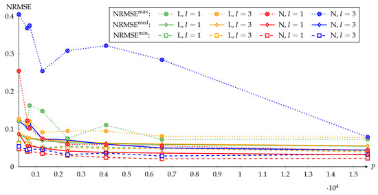 The mean of the error vector of the quasi-linear approximation problem is not clearly influenced by the particle count. Furthermore, the varying signs of the means close to zero speak against a bias for the quasi-linear approximation problem. In contrast, for the nonlinear approximation problem, the means are always negative and, therefore, biased. The negative sign is a problem-specific result and means that the solution is, in general, between and . The bias itself, however, seems to be a systematic effect of the interaction of KF and PF of which the system models are weighted relative to each other according to the covariance matrix of process noise for linear states and the covariance matrix of process noise for nonlinear states . Decreasing might help to reduce the magnitude of this bias. Moreover, we note that the absolute values of the means become smaller as the particle count is increased. As the NRBA results for nonlinear approximation problem rely heavily on the PF, this relation is comprehensible.