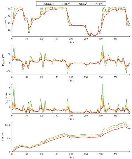 The first diagram of Figure 8 displays the velocity v versus the time according to the velocity set points of the reference as well as three trajectories optimized by NRBA. The NRBA trajectories are denoted , , and and differ in the choice of . We use for , for , and for . The remaining parameter values are , , , , , , , , , and .