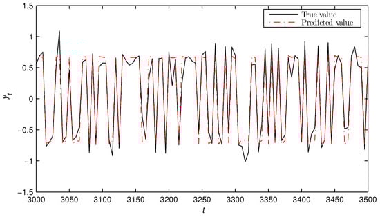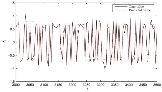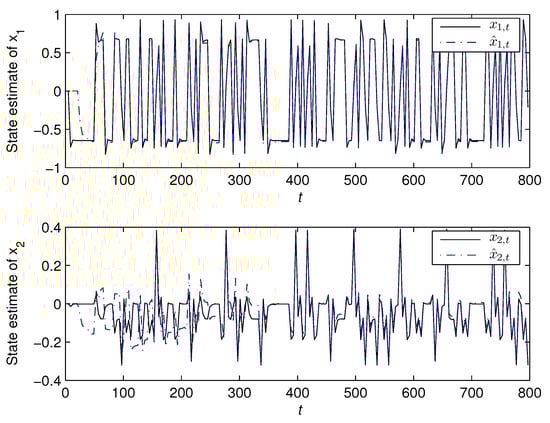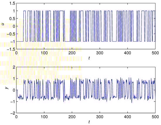 In the simulation, the input signal {} was chosen as a pseudo-random binary sequence with zero mean and unit variance and as a white noise sequence with zero mean and variances . Set the data length , and employ the proposed algorithms to estimate the parameters and states of this example system. The simulation input and output data are shown in Figure 1, which indicate that the bounded input signal leads to the bounded output. The parameter estimates and their estimation errors of the RGLS algorithm and the F-TS-RGLS algorithm are shown in Table 2 and Table 3. The RGLS estimation error versus t is shown in Figure 2 with and . The F-TS-RGLS estimation error versus t is shown in Figure 3 with different variances. The predicted outputs and the true outputs are shown in Figure 4 and Figure 5. The states and their estimates versus t are shown in Figure 6.
