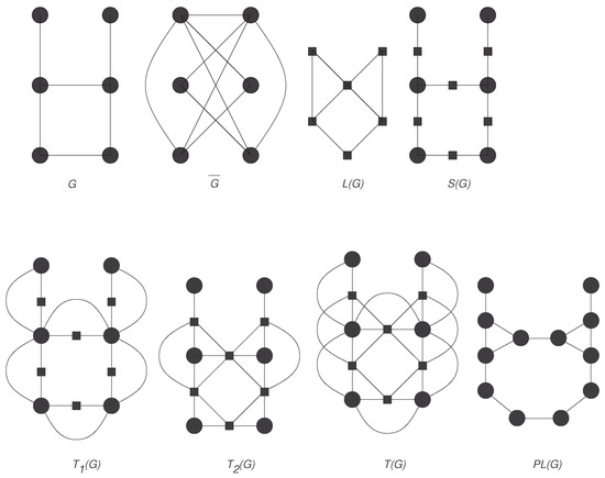 In Figure 1, self-explanatory examples of these derived graphs are given for a particular graph. In every derived graph of G (except the paraline graph ), the vertices corresponding to the vertices of G are denoted by circles and the vertices corresponding to the edges of G are denoted by squares.