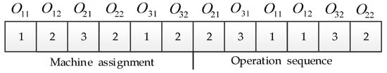 As mentioned above, the FJSP contains two subproblems, i.e., machine assignment and operation sequence. For this feature, a two-segment string with the size of 2mn is used to represent the scheduling solution. The first segment aims to choose an appropriate machine for each operation, and the second segment represents the processing sequence of operations on each machine. Taking a 3 × 3 (three jobs, three machines) FJSP as an example, each job has two operations. The scheduling solution is shown in Figure 1. For the first segment, the element means the operation chooses the jth machine in the alternative machine set, where all elements are stored in a fixed order. For the second segment, each element represents the job code, where the elements with the same value mean different operations of the same job , and presents the kth operation of the job .