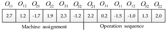 In our proposed IWOA, the individual position is still denoted as a multi-dimensional real vector, which also consists of two segments string with the size of mn, i.e., , where . The first segment denotes the information of machine assignment, and the second segment presents the information of operation sequencing. For the above 3 × 2 FJSP, the individual position vector can be represented by Figure 2, where element values are listed in the given order. In addition, the intervals are all set as , where presents the number of the jobs.