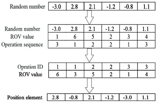 For the operation sequence segment, firstly, it is needed to randomly generate mn real numbers in the range corresponding to the scheduling solution. According to the ranked-order-value (ROV) rule, a unique ROV value is assigned to each random number in an increasing order, so that each ROV value can correspond to an operation. Secondly, the ROV value is rearranged according to the coding order of the operations, and the random number corresponding to the rearranged ROV value is the value of the element of the individual position vector. The conversion process is shown in Figure 3.