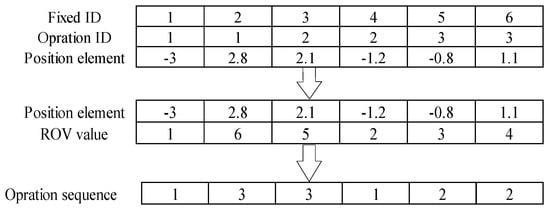 For the operation sequence segment, the ROV value is firstly increasingly assigned to each element of the individual position vector, and then used as the Fixed ID. Therefore, a new operation sequence can be obtained by corresponding the ROV value to the operations, which is shown in Figure 4.
