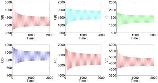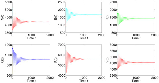 In this section, we present some numerical simulations to support our obtained theoretical results. Choosing , , , , , , , , , , , , and , then Equation (2) becomes