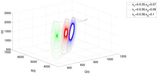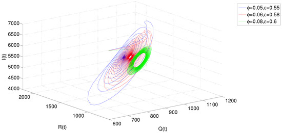 Dynamic behavior of system (22): projection on I-Q-R for different and at .
