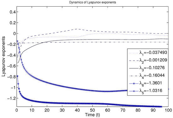 In addition, in the presence of delay, the Lyapunov exponents (LE) have been derived numerically. For a non zero value of , LE for different species have been plotted in Figure 10. As all LEs are negative, then the system is stable.