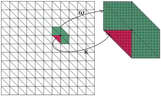 An illustration of coarse mesh (left), a coarse neighborhood and coarse blocks (right).