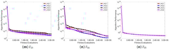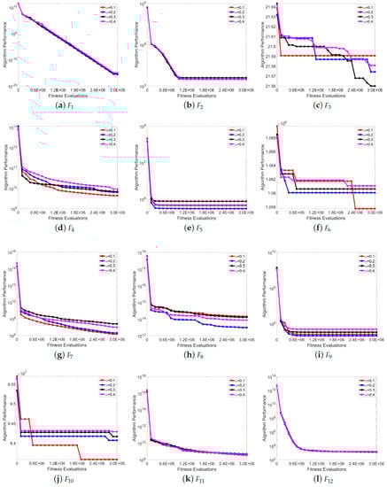 In this study, the value of was used to balance the abilities of exploration and exploitation. Hence, we investigated the influence of to algorithm’s performance. In this test, we set as 0.2, 0.3 and 0.4. For other parameters, we used the same setting as in Table 1. For each value of , we ran the algorithm 25 times and present the mean optimization results in Table 2. According to the results, there was no significant difference in the order of magnitude. On the other hand, for the four values, and , both won six times, which demonstrates that a small value of would help the algorithm achieve a more competitive optimization performance. The convergence profiles for algorithm’s performances with different values of are presented in Figure 3.