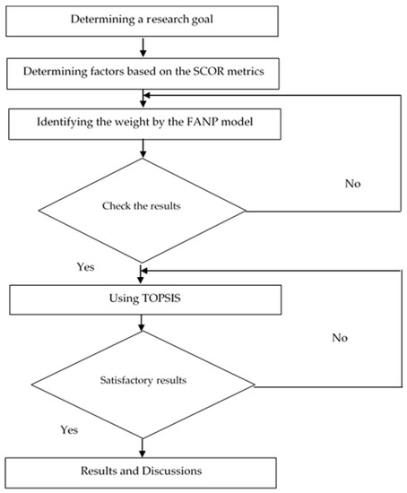 SCOR metrics are categorized into five performance attributes: reliability, responsiveness, agility, costs, and asset management efficiency. The Fuzzy Analytic Network Process (FANP) method is a widely used multi-criteria method to handle the interaction among the criteria and linguistic variable, and the Technique for Order of Preference by Similarity to Ideal Solution (TOPSIS) is a multi-criteria decision analysis method, which was originally developed by Ching-Lai Hwang and Yoon in 1981 with further developments by Yoon in 1987, and Hwang, Lai and Liu in 1993. TOPSIS is based on the concept that the chosen alternative should have the shortest geometric distance from the positive ideal solution (PIS) and the longest geometric distance from the negative ideal solution (NIS). More detail about the SCOR metrics, the FANP model, and the TOPSIS approaches are shown in Section 3.2.1, Section 3.2.2, Section 3.2.3, and Section 3.2.4.