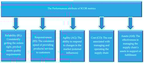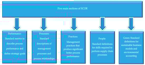 SCOR was proposed by Theodore et al. [34,35]. The SCOR reference sourcebook consists of five main sections which are shown in Figure 2. The performance or metrics section of the SCOR focuses on understanding the outcomes of the supply chain and consists of two types of elements: Performance Attributes and Metrics, and introduces the concept of Process/Practice Maturities.