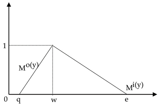 The Triangular Fuzzy Number (TFN) can be defined as (q, w, e), where q, w, and e (q ≤ w ≤ e) are parameters indicating the smallest, the promising, and the largest value in the TFN, respectively. The TFN is shown in Figure 4.