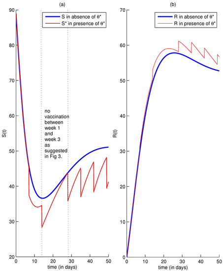 In Figure 1a, the optimal state decreases rapidly towards 38 individuals in the first week and this value is smaller than the one taken by S because of the optimal impulse control intervention. However, once we go more forward in time, the effect of control becomes negligible and this causes a slight increase of between 10 and 12 days, and then an simultaneous increase of the function in Figure 2a in the same period to 57 individuals in the first week but decreases again to 27 people and this implies to some small increases of compared to S, and we remark once there is a vaccination interruption just after the time of impulse, does a slight jump again and again causing repeated small decreases of . Simultaneously, the number of removed people R in Figure 1b increases to 57 people before the third week because of the natural recovery or any effect of other missed control policy in removing the infectives, while reaches a value that is higher than this number with a maximal peak equaling to 62 in the third week.