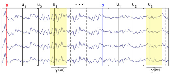 Figure 2. EEG signals recorded from four electrodes. The sequence of stimuli is indicated in the top horizontal line. Vertical lines indicate the beginning of the successive auditory units. The distance between two successive vertical lines is . Solid vertical lines indicate the successive occurrence times of the string . The first yellow strip corresponds to the chunk associated to the string . The second yellow strip corresponds to the chunk associated to the string . - For any pair , test the null hypothesis that the law of the EEG chunks and collected at Step 2 are equal.