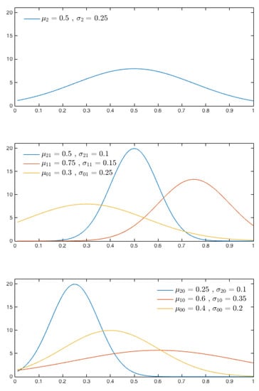 In this section, we illustrate the performance of Algorithm 1 by applying it in a toy example. We consider the context tree model compatible with described in Section 2 with . For each , we assume is the law of a diffusion process with drift coefficient and constant diffusion coefficient. For simplicity, all diffusion coefficients are assumed to be 1. For each context , we assume , where K is a positive constant and is the density of a Gaussian random variable with mean and standard deviation , restricted to the interval . In the simulation, we take . The shapes of the functions and corresponding values of and are shown in Figure 3. One can check that the assumptions of Theorem 1 are satisfied by this toy example.