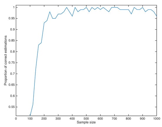 Proportion of correct identification of the context tree by applying Algorithm 1 to simulated data with sample sizes For sample sizes larger than 200, the proportion of correct identification is at least .