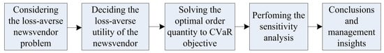 In this section, we investigate the optimal order decisions of the loss-averse newsvendor in a backorder setting. First, we solve the optimal order quantities to maximize the expected utility and CVaR about utility, respectively. Then, based on the optimal order quantities, we perform sensitivity analysis to analyze the properties of the optimal order quantities. Finally, we present management insights based the obtained results. The flowchart of the research is given in Figure 1.