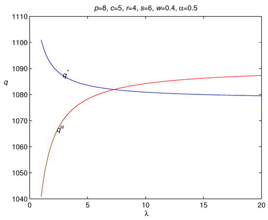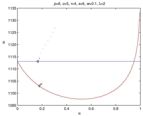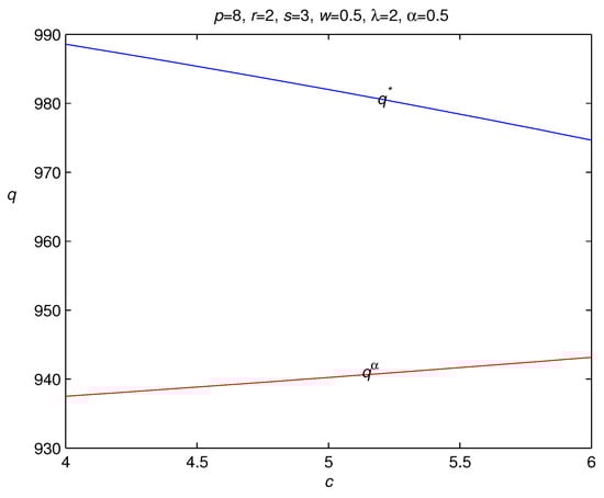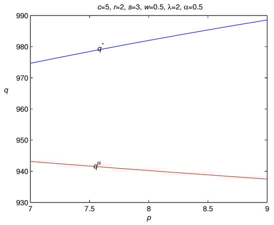 If , the optimal order quantity is increasing in the wholesale price c. Otherwise, and the optimal order quantity is decreasing in the wholesale price c. The above results show that the change directions of the optimal order quantity with regard to the retail price and the wholesale price are indefinite. These results are different from the previous study on the newsvendor model, where the optimal order quantity is definitely increasing in the retail price and decreasing in the wholesale price. We have the following management insights from these results. The increase in the retail price may lead to the decrease in the market demand, and it is better for the loss-averse newsvendor to order fewer items to avoid the risks from over-ordering. However, the previous study on the newsvendor model always results in the conclusion that a newsvendor should order more items when the retail price increases (Gotoh and Takano []; Xu and Li []; Chen et al. []), which contradicts this common fact. Therefore, our result presents a new ordering policy that is consistent with this common fact, and provides theoretical evidence to explain it for the loss-averse newsvendor. That is, a bigger retail price leads to a smaller market demand, and the loss-averse newsvendor should order fewer items to reduce the over-ordering loss when the retail prices increases. To illustrate this result, we have the following example.