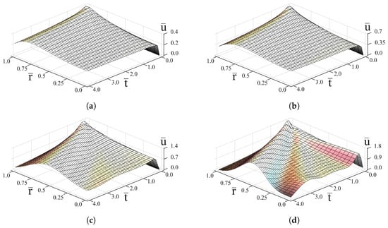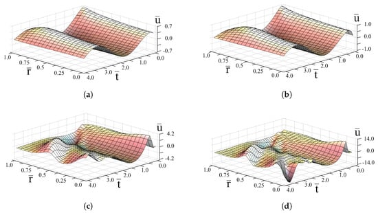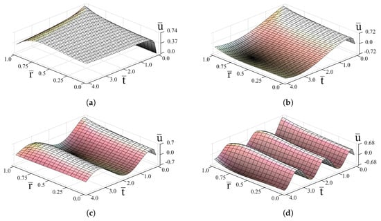 It is seen from Figures that time oscillations of the solution are governed by the harmonic term . The increasing of absorption parameter b decreases the oscillation amplitude (Figure 2b and Figure 3d), whereas increasing increases it (Figure 2a–d and Figure 3d). As the Mittag-Leffler function