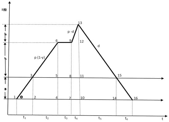Considering Figure 1, it is found that the time required to produce lot size Q at the production rate p is the sum of the time required by different processes to produce Q units. These processes include the time required for planned backorder units to be fulfilled when the process starts again (), time required to manufacture lot size (), time required to inspect the manufactured units (), and time required to rework imperfect units (), i.e.,