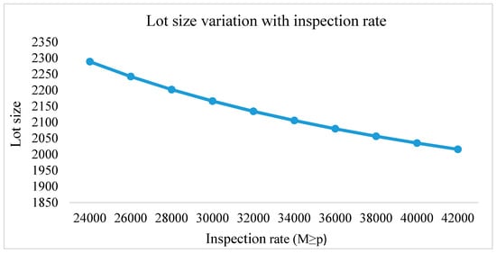 Table 2 shows the impact of the defective rate on the optimal lot size (Q) and optimal backorder quantity (B). It can be observed that lot size increases with an increase in the percentage of the defective rate. Similarly, the total cost variation is also significant. Total cost is increased with an increase in imperfection during the manufacturing process. However, an increase in the optimal backorder quantity level is relatively low with an increase in the defective rate. Comparing these results with the results obtained by Cárdenas-Barrón [] (Example 1), it can be observed that the total cost of our proposed model is comparable for the range of imperfection (0%, 40%). However, the lot size has been increased significantly. The backorder quantity increases up to 35% of the defective rate and then decreases with increases in defective products.
