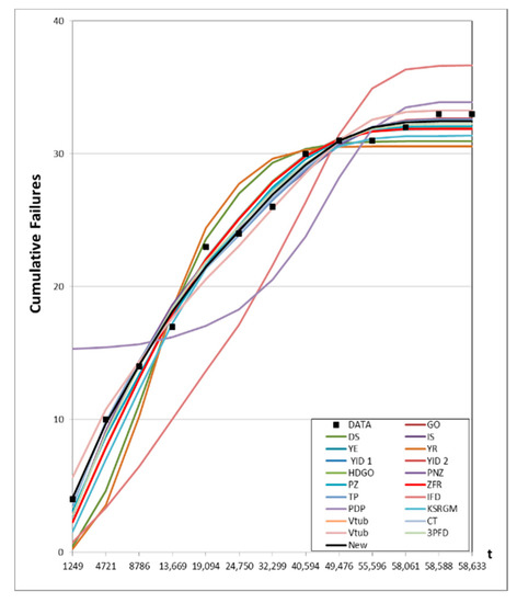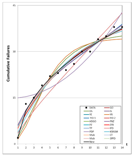 We estimate the parameters of the NHPP software reliability models in Table 1 using the least squares estimation (LSE) method. We derived the parameters of the mean value function using Matlab (2016a, MathWorks, Natick, MA, USA) and R (Version 3.3.1) programs based on the LSE method.