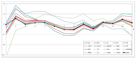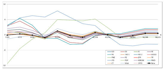 Looking at Table 7 in detail, we can observe that the MSE, RMSE, AIC, variance, RMSPE, PRR, TS, PP, and SAE values for the proposed model are the lowest values among all models compared. The and values for the proposed model are the largest values among all the models compared. First, the MSE value of the proposed model is 0.8790, which is the lowest value among all the models compared, and the MSE value of the YID 2 model is 0.9229. The RMSE value of the proposed model is 0.9376, which is the lowest among all the models compared, and the RMSE value of the YID 2 model is 0.9607. The variance value of the proposed model is 0.7662, which is the lowest among all the models compared, and the variance value of the CT model is 0.7878. The RMSPE value of the proposed model is 0.7664, which is the lowest among all the models compared, and the RMSPE value of the CT model is 0.7889. The PRR value of the proposed model is 0.0149, which is the lowest among all the models compared, and the PRR value of the CT model is 0.0191. The TS value of the proposed model is 2.8923, which is the lowest among all the models compared, and the TS value of the CT model is 2.9636. The PP value of the proposed model is 0.0149, which is the lowest among all the models compared, and the PP value of the CT model is 0.0184. The SAE value of the proposed model is 7.6843, which is the lowest among all the models compared, and the SAE value of the CT model is 7.8468. The MAE value of the proposed model is 0.9605, which is the lowest among all the models compared, and the MAE value of the CT model is 0.9809. The and values of the proposed model are 0.0.9937 and 0.9891, respectively, which are the largest among all the models compared. The and values of the YID 1 model are 0.9933 and 0.9886, respectively. Although the YID 2 model is smaller than our proposed model based on AIC criterion, the performance of our proposed model based on all the other remaining eleven criteria are not only much better as compared with the YID 2 model but also as compared with all the models, as shown in Table 7. Figure 5 shows a graph of the mean value functions for all the models based on dataset #2. Figure 6 shows a graph of the relative error value of all models for dataset #2.