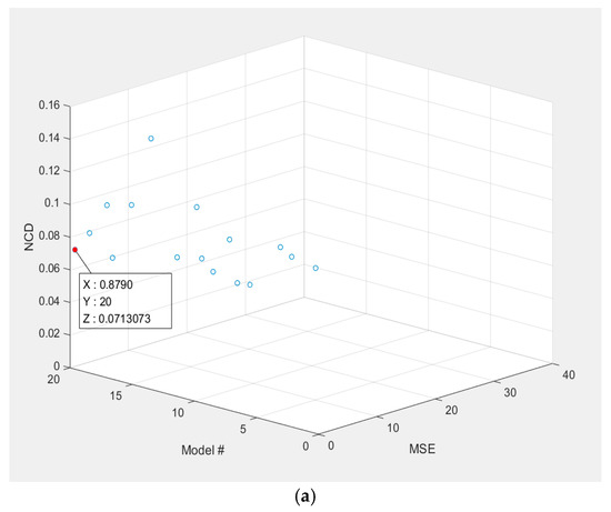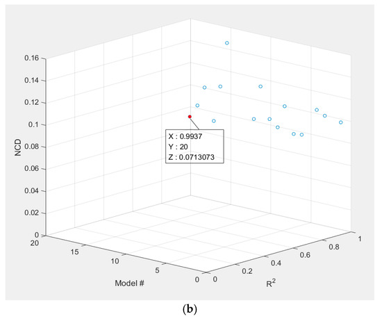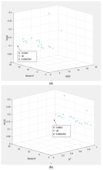 3D plot for dataset #1 (a) MSE value, model number, NCD value; (b) R2 value model number, NCD value.