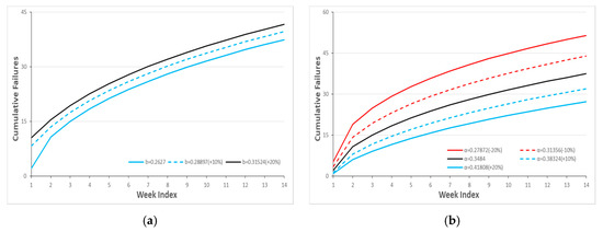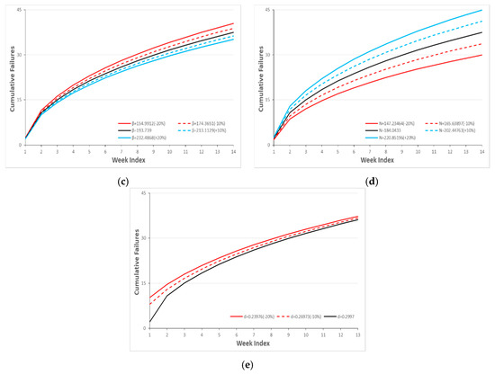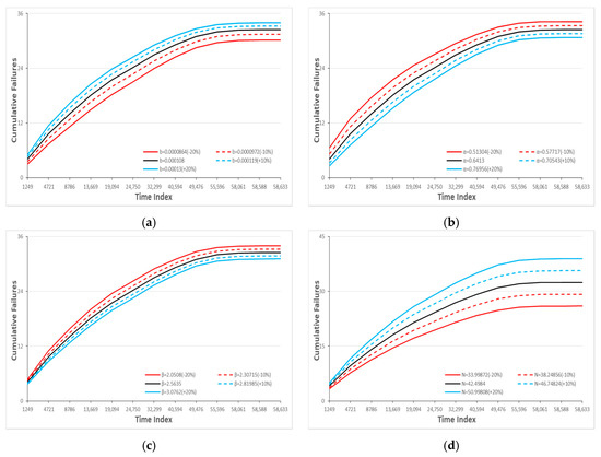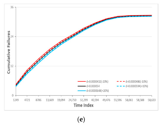 In this study, we investigated the effect of each parameter of the proposed model on the mean value function by performing sensitivity analysis. We conducted the sensitivity analysis by changing one of the parameters of the model and fixing all the other parameters. We examined how the value of the estimated mean function changes when the estimated parameter values obtained from dataset #1 and dataset #2 change from –20% to +20%. Figure 9 shows sensitivity analysis for five parameters in the proposed model based on dataset #1. As can be seen in Figure 9, the cumulative number of detected failures will change with each estimated parameter. Figure 10 shows the sensitivity analysis for five parameters in the proposed model based on dataset #2. From Figure 10, it can be seen that the cumulative number of detected failures will be change with each estimated parameter. Therefore, it appears that the parameters are all influential in the proposed model.