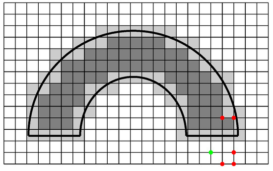 Figure 1 shows the grid description over a domain. The light grey cells are the boundary cells while the dark grey cells are referred to as the inner cells. The set of quadratic outer B-splines are shown as the red dots placed on the lower left corner of the support of the corresponding B-splines while the green dots are the inner B-splines. The quadratic B-splines are considered for the description.