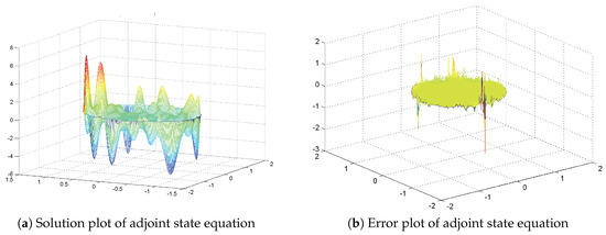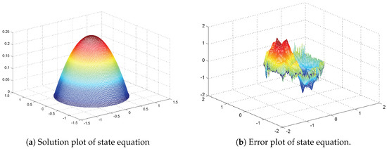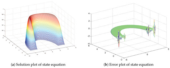 Let and where . The domain of a unit circle is taken with . The function , the matrix and the parameter is used. The solution and error plot of state equation are given in Figure 3.