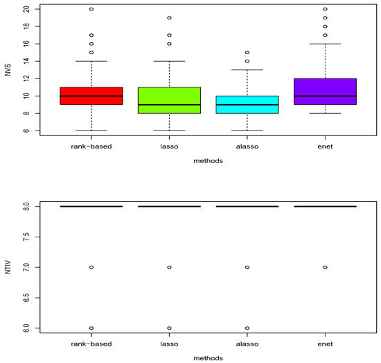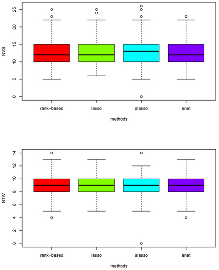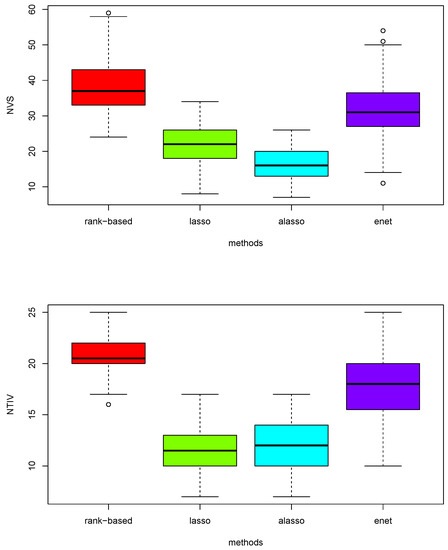 Furthermore, we compared the performance in terms of selecting the number of true important variables by each of the four methods under three different simulation scenarios. First, we performed multiple hypothesis testing with BH-FDR [15] to reduce the dimensionality of the data. After performing a screening step to retain the relevant variables, we used them as input for the proposed rank-based penalized method with the regularization step outlined in Section 2.3. We illustrate the performance of variable selection with boxplots in Figure 2, Figure 3 and Figure 4 for simulation scenarios 1, 2, and 3. Each figure displays two boxplots, which, in turn, depict the distribution of the number of variables selected (NVS) and the number of true important variables (NTIV) within the number of variables selected (NVS) with each of the four methods computed based on the given number of iterations in each of the three simulation scenarios.