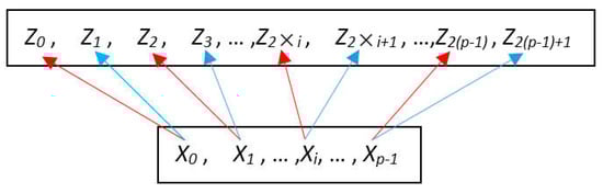 To avoid the defect of the local optima, we expand the data amount of population X, hence we get an expanded scope of data search. We use two data splitting strategies to split a bipartition scheme into two. Thus, by using the first data splitting strategy each individual Xi (0 ≤ i < p) in population X generates an individual Z2×i, and by using the second data splitting strategy each individual Xi (0 ≤ i < p) generates an individual Z2×i+1. By doing this, p individuals in population X are divided into 2 × p individuals, and the enlarged population Z is constructed (|X| = p, |Z| = 2 × p). Figure 3 shows the population expansion, where the red arrow indicates the effects of the first data splitting strategy and the blue arrow the effects of the second data splitting strategy.