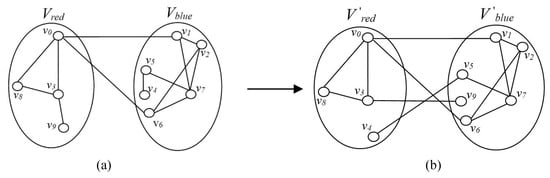 Suppose the number of red vertices is 4 in the given graph G = (V, E), V ={v0,v1, … ,v9}. We obtain a bipartition scheme (Vred, Vblue), as shown in Figure 4a, in which set Vred ={v0,v3,v8,v9}, Vblue ={v1,v2,v4,v5,v6,v7}, where the degree of vertex v9 in set Vred is the smallest, and that of vertex v4 in set Vblue is the smallest. After exchanging the two vertices, a new bipartition scheme (V‘red, V‘blue) is generated. The new bipartition scheme (V‘red, V‘blue) after splitting is: V‘red ={v0,v3,v4,v8}, V‘blue ={v1,v2,v5,v6,v7,v9}, as shown in Figure 4b.