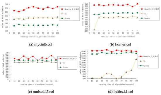 The third group of tests aimed at comparing the search results after each algorithm was run on four benchmark instances, namely myciel6.col, homer.col, mulsol.i.5.col and inithx.i.1.col, for the first one 100 s. The results that algorithms found were collected at an interval of 10 s. The running time was regarded as the X coordinate on the axis and the value of MLCP solution as the Y coordinate.
