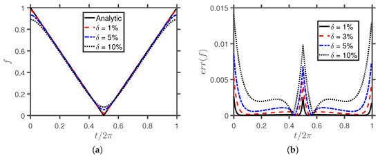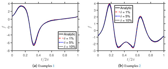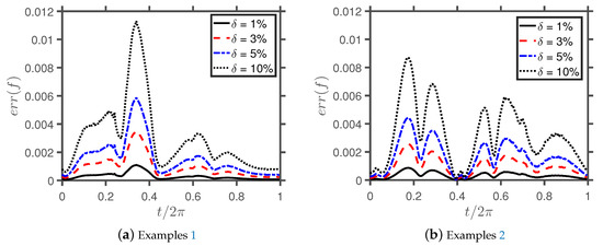 Figure 2 shows the numerical results corresponding to Examples 1 and 2, and Figure 3 shows the relative errors of f. It can be seen that the numerical solutions are stable approximations of the analytic solution, and the numerical solution converges to the exact solution as the level of noise decreases.