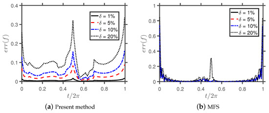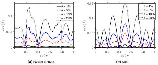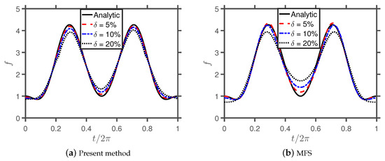 Figure 6a,b show the numerical results obtained by the present method and the MFS. Figure 7a,b show the relative errors of f obtained with various amounts of noise added in the boundary data on . From these figures, we can see that the numerical solutions obtained by the present method are stable approximations of the temperature on the boundary. It also should be noticed that the presented method yields more accurate, convergent and stable numerical results than the MFS.
