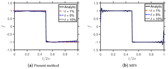 In this example, the temperature on the boundary has a jump. Figure 8a,b show the numerical results obtained by the present method and the MFS. In order to check the efficiency of the present method (see Figure 9), we give a comparative study between the present method (PM) and the MFS. Table 2 shows the values of the regularization parameter, , and the corresponding errors, , obtained using the presented method and MFS, and various amounts of noise added in the boundary data, for Examples 4 and 5. The condition numbers of the MFS are and , but the present method can reduce the condition numbers to and . From this figure, we can see that the numerical solutions obtained by the present method are stable approximations of the temperature on the boundary. It also should be noticed that the presented method yields more accurate, convergent and stable numerical results than the MFS. Especially in the jump points, the presented method gives more stable numerical results than the MFS.