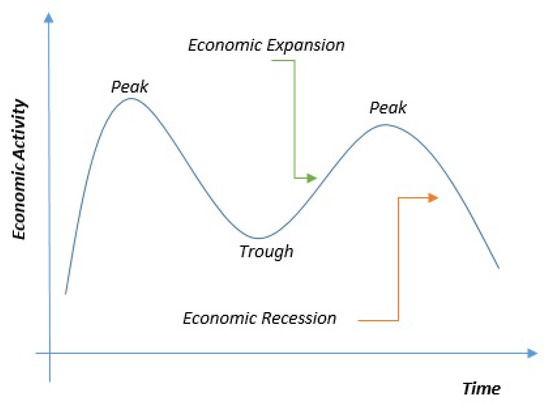 Cyclical fluctuations in economy, Figure 3, correspond to the duration or the amplitude between a high/peak and the succeeding low/trough [35]. The so-called peak-trough-peak (PTP) cycle affects the whole economy (e.g., wages, demand, prices, credit, etc.). Seasonal swings are typically short-term, but cyclical fluctuations could last for years. A depression is a prolonged and deep recession. As mentioned by Eckstein (1986) [36] when “financial distress produces sharp discontinuities in flows of funds and spending and when the financial strains include tight monetary policy, much lessened availability of money and credit, sharp rises of interest rates, and deteriorating balance sheets for households, businesses, and financial institutions”.