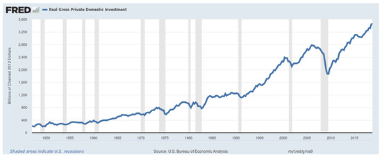 USA real gross private domestic investment ( GPDIC1 ), billions of chained 2012 dollars, seasonally adjusted annual rate. Source: FRED, Federal Reserve Bank of St. Louis; https://fred.stlouisfed.org/series/GPDIC1, 16 March 2019. Greyed areas correspond to periods of economic recessions (Table 1).