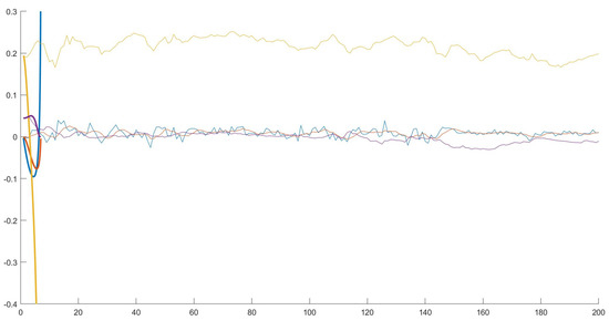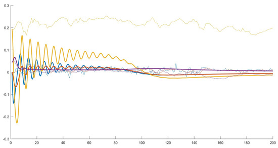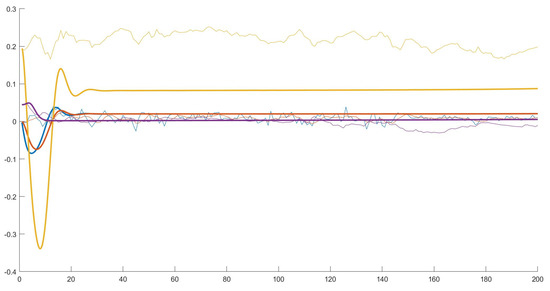 Since the aim of this work is to evaluate the Harrod’s model, we report in Table 3 the parameters for both the original model and three calibrations we have obtained that present qualitatively different behaviours (together with the value of their distance D—for calibration 2, D is computed with ). The model, calibrated with real data, may display convergence to a long-run equilibrium (calibration 1, Figure 5), divergence (calibration 2, Figure 6) as well as a lightly damped oscillatory behaviour (calibration 3, Figure 7). It is worth saying that the global optimum is obtained with calibration 1. However, with calibrations 2 and 3, we displayed sub-optimal results to provide a context for our results. In fact, qualitatively, we obtain similar values to the ones in [34]. Moreover we concur with this conclusion “when the value of is large enough, the long period dynamics of the saving rate is such that it can generate an irregular cycle in the system only if the net export rate is very low. On the contrary, starting from positive and meaningful values of the net export rate, the system may simply generate a limit cycle (or at most a double cycle) if a higher works together with adequate competitiveness on the foreign markets. This is the only formal result consistent with Harrod’s intuition that a more moderate cyclical instability can emerge in an open economy compared to a closed one”.