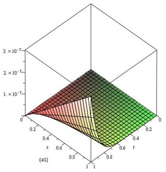The NTDM solution for and 1 are reported in Table 1. The surface solution behavior of for different values of 1, , and are depicted in Figure 1, and the plots of the solution for at different time intervals is depicted in Figure 1. The error plot of Example 1 show in Figure 2.